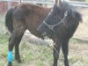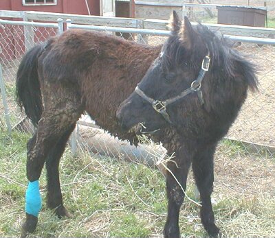It was several days before we felt she had all four feet on this side of death's door, but within a week we were confident that her wound was responding to treatment and the infection was leaving her body. Winona was put on a small pasture with fresh spring grass, and was wormed and de-loused. Another auction rescue, Lio, was placed in the same pasture to be Winona's companion, and this lifted her spirits even more. Now, a full two months after her rescue, Winona's flaky skin and patchy, mangy fur are being shed and replaced with a sleek, shiny black coat. Daily attention to her wound has paid off, and what started out as a dollar-bill sized injury has shrunk down to an area the size of my thumb. Her gaunt, bony frame has begun filling out, and her frail helplessness is being replaced by the spunky sweetness of a normal two-year-old filly.